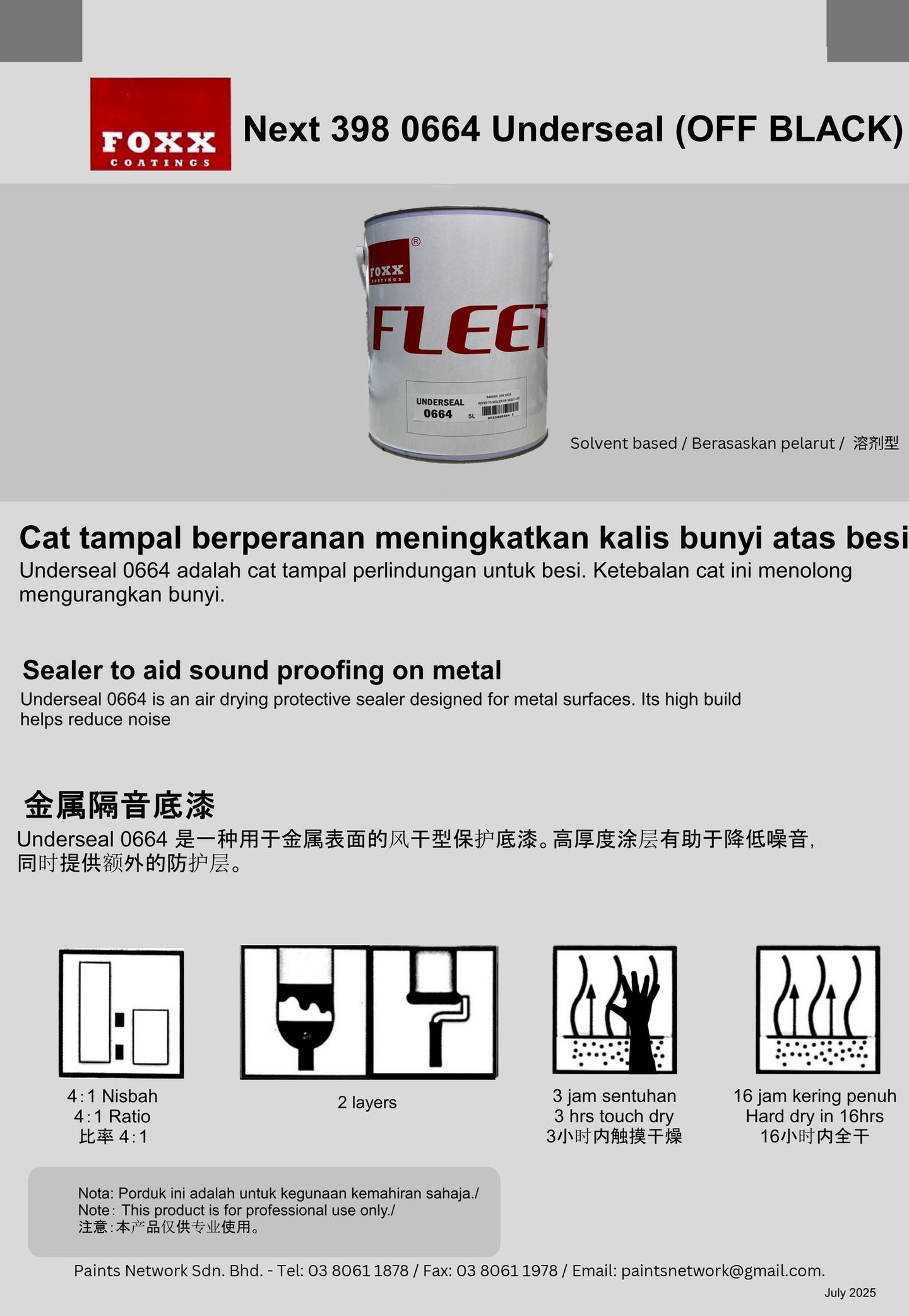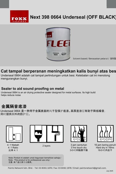 Cat tampal berperanan meningkatkan kalis bunyi atas besiUnderseal 0664 adalah cat tampal perlindungan untuk besi. Ketebalan cat ini menolong mengurangkan bunyi. Sealer to aid sound proofing on metal Underseal 0664 is an air drying protective sealer designed for metal surfaces. Its high build helps reduce noise 金属隔音底漆 Underseal 0664 是一种用于金属表面的风干型保护底漆。高厚度涂层有助于降低噪音, 同时提供额外的防护层。